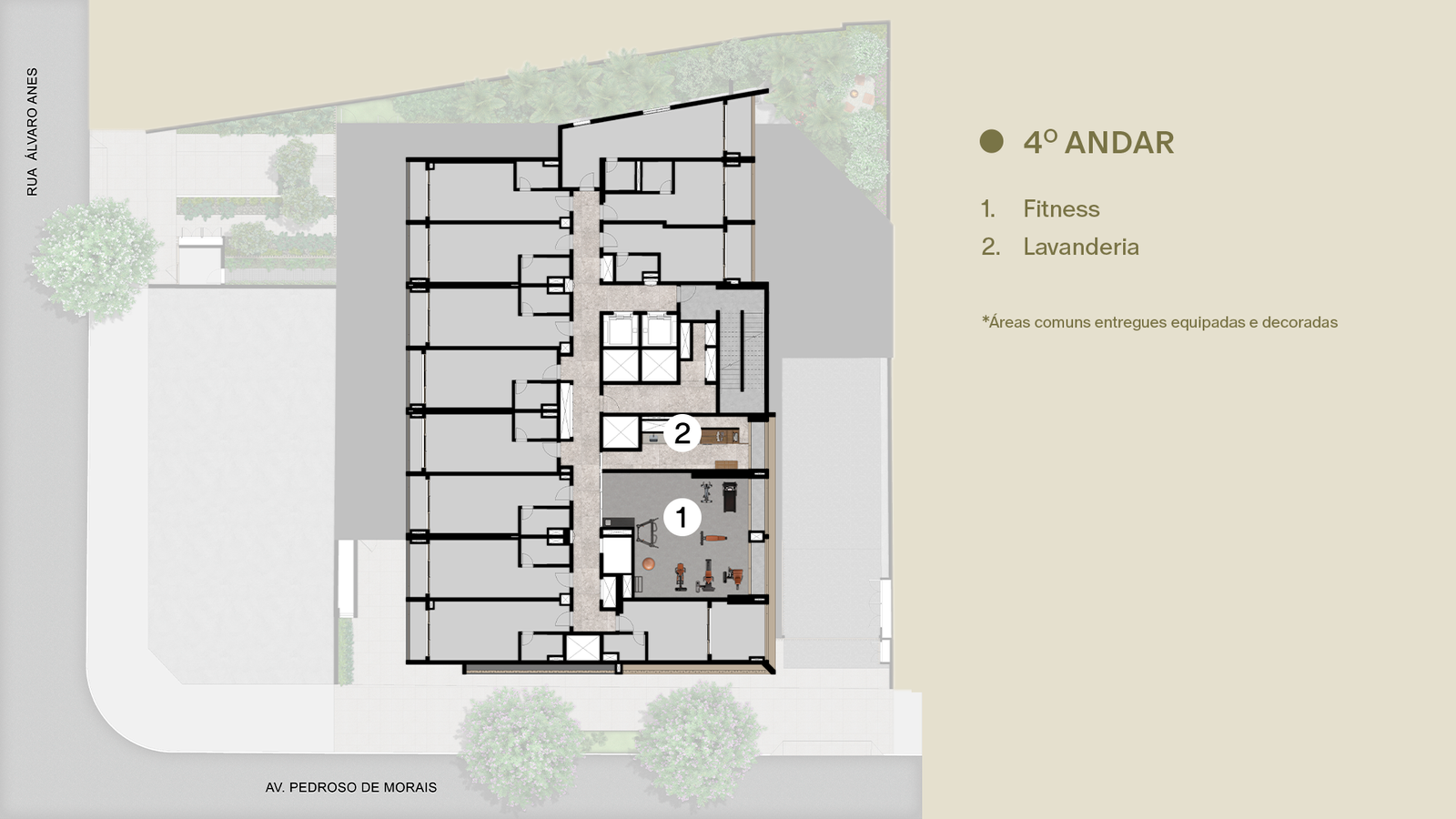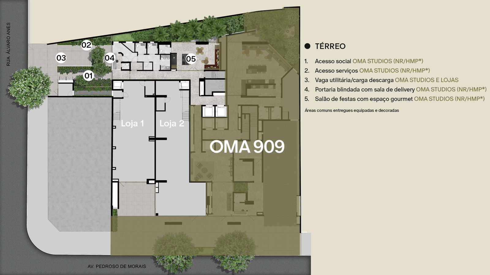Localizado entre a Av. Pedroso de Morais e a Rua Álvaro Anes, este terreno apresenta uma característica privilegiada, está defronte à Praça dos Omaguás. E o fato de possuir acesso por diferentes ruas permitiu a coexistência de dois edifícios independentes dentro de uma mesma torre – OMA 909 e o OMA STUDIOS, com aptos HMP * e unidades NR. O OMA STUDIOS terá acesso exclusivo pela Rua Álvaro Anes, 34 e com lazer dividido em 2 pavimentos: sendo o salão de festas no térreo; fitness e lavanderia coletiva no 4º andar.